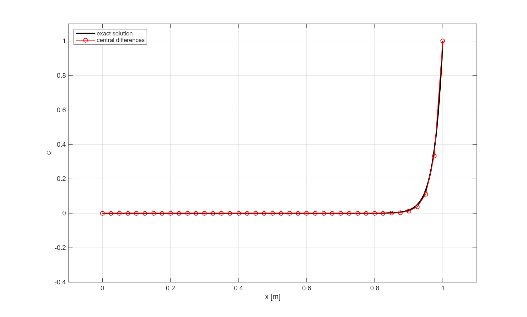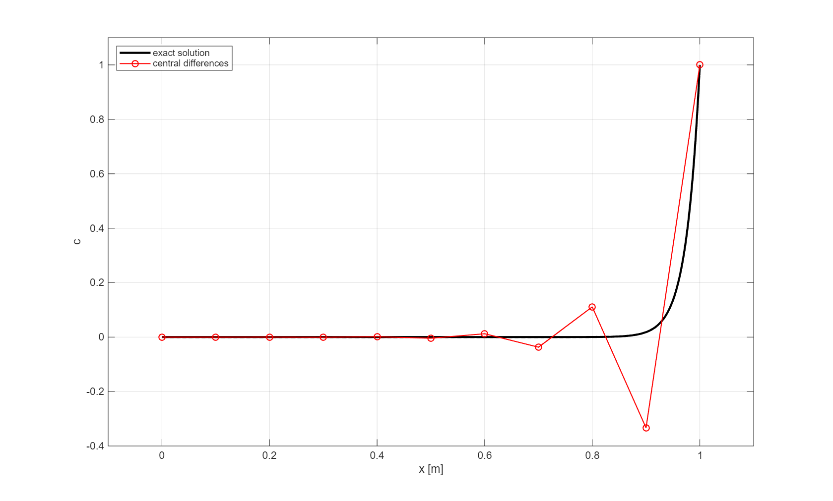Fig. 1.9 Solution obtained with central differences and \(\Delta x = 0.1\) m.#