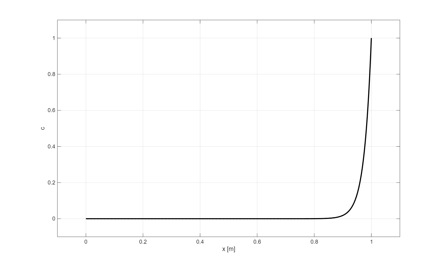 The solution to this BVP is the spatial distribution of the constituent \(c(x)\) along the interval \(0 \leq x \leq 1\) as depicted below.
