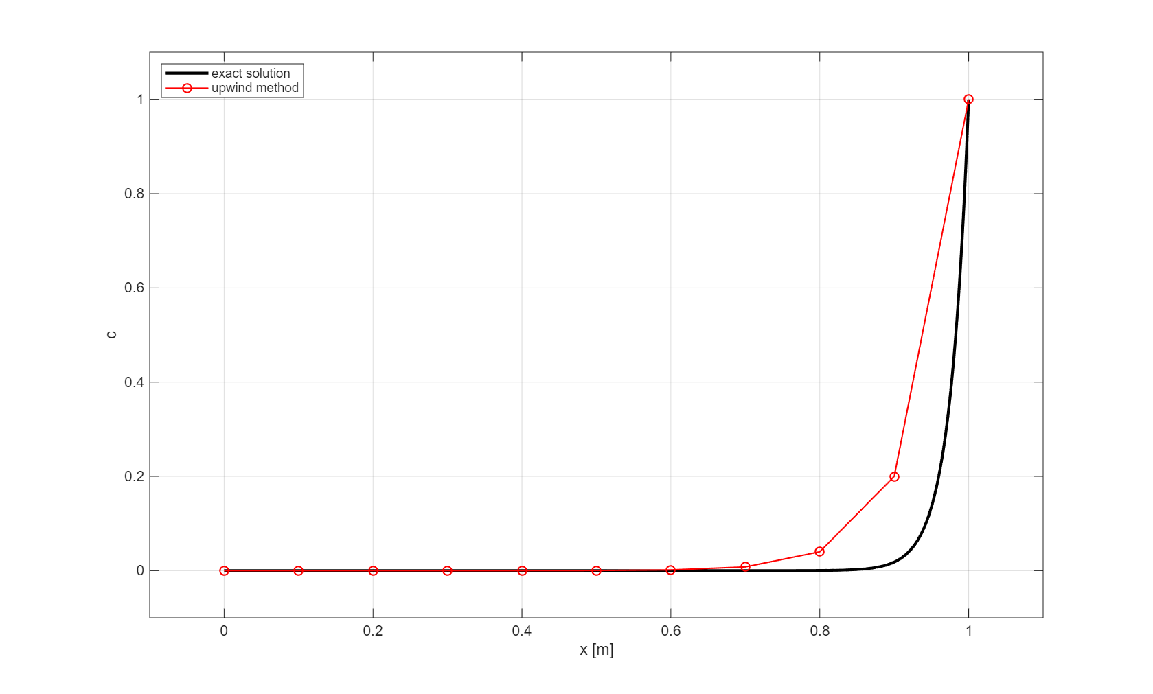 With \(\Delta x = 0.1\) m, we find \(P_{\Delta} = 4\). Furthermore, the amount of numerical diffusion equals \(\kappa_a = 0.5 \times 1 \times 0.1 = 0.05\) m\(^2\)/s which is twice larger than the physical one. The corresponding numerical solution is depicted below which shows that it is rather inaccurate. Note that the boundary layer thickness of the numerical solution is larger than that of the exact one due to numerical diffusion.
