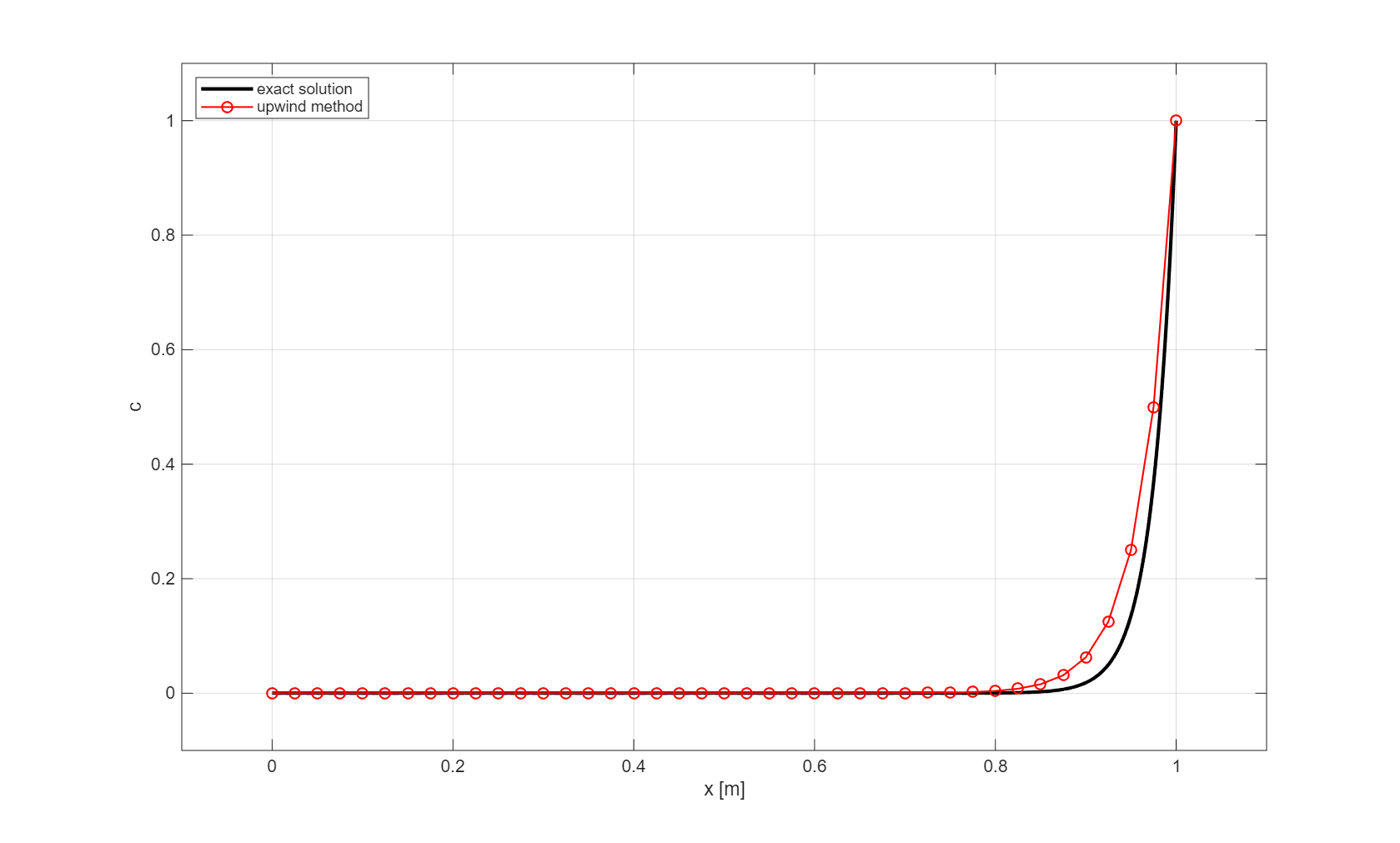 Fig. 1.11 Solution obtained with the first order upwind scheme and \(\Delta x = 0.1\) m so that \(\kappa_a = 0.05\) m\(^2\)/s.#