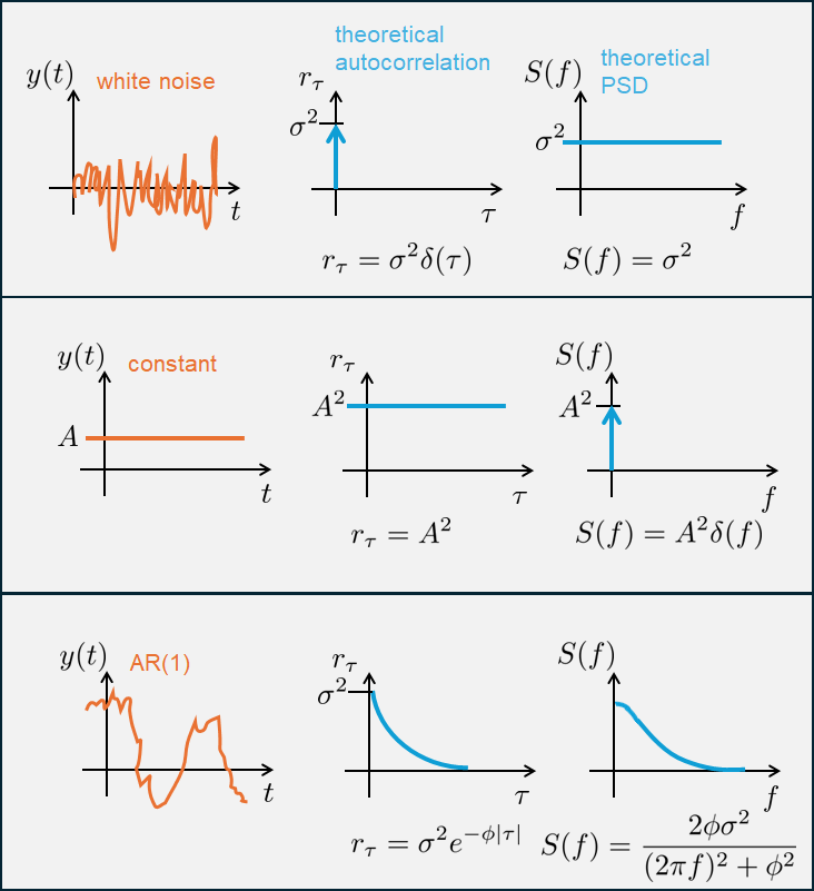 In the first row, we observe the theoretical autocorrelation of white noise, which is a Dirac delta function \(\delta (\tau)\) located at the zero lag \(\tau = 0\) with amplitude equal to the noise variance \(\sigma^2\). This reflects that white noise is uncorrelated, meaning that its autocorrelation is zero for all non-zero lags \(\tau \neq 0\). In reality, when computing the autocorrelation of a realization of white noise, we typically see a non zero value of autocorrelation at lag zero, and values close to zero at other lags. The corresponding PSD of white noise is constant across all frequencies, indicating equal power distribution over the frequency spectrum.