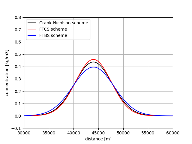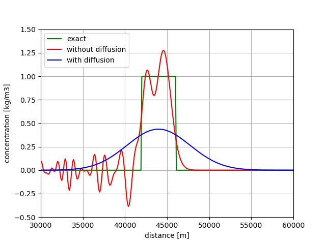 The case without diffusion (\(K=0\)) represents a propagated substance along the river as shown by the green curve. Its shape is fixed throughout the propagation. However, the Crank-Nicolson scheme is not able to conserve this block-shaped profile. The associated numerical solution contains wiggles as the scheme does not have numerical diffusion.
