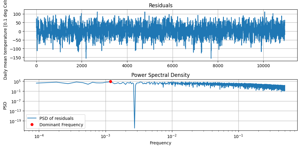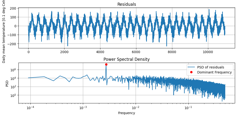 First run: we fit a linear model (with intercept and slope) to the data and find the dominant frequency of 1 cycle per year. This one clearly stands out in the PSD (periodogram) of the residuals, hence the present residual time series is not stationary, so we need to do this step again.