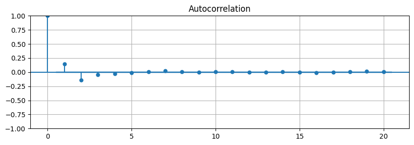 We see hardly any autocorrelation in the residuals of the AR(1) model; apart from the lag 0 entry, which is 1 by definition, the other values are approximately zero (hence, with a little bit of approximation we can say that the remaining residuals seem to result from a white noise process), so the AR(1) model is (quite) a good fit to the residuals of Part 2. If the AR(1) model is not a good fit to the residuals we could try a higher order AR model (which is beyond the scope of the MUDE).