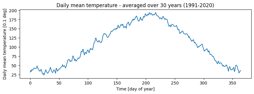 Compute and make a plot of the daily temperature averaged over the 30 years time frame from 1991 to 2020. Include the resulting plot in your report.