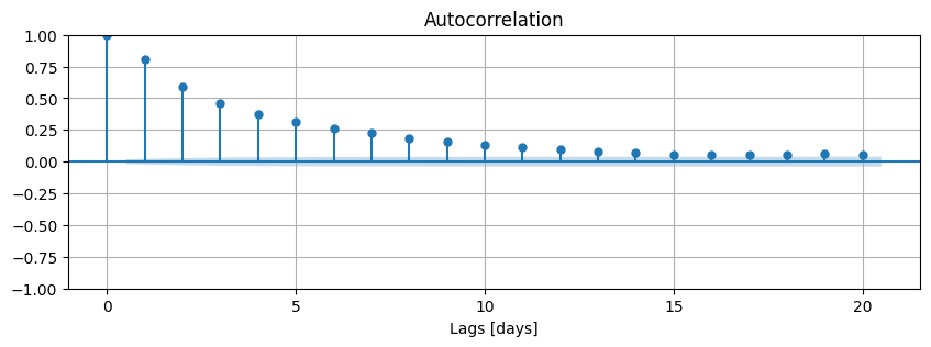 The residuals do not originate from a white noise process; they show some kind of ‘memory’ (over a duration of about 10 days).