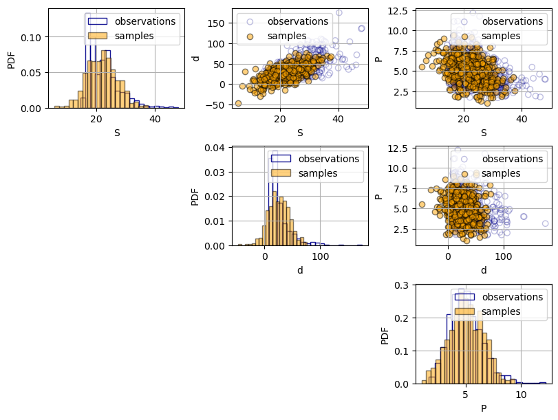 Regarding the bivariate plots, the samples seem to capture the strength of the dependence in the observations, However, the shape of the dependence of the samples is more elliptical, while in some pairs that does not fully hold (e.g.: plot \(S\) and \(P\)).